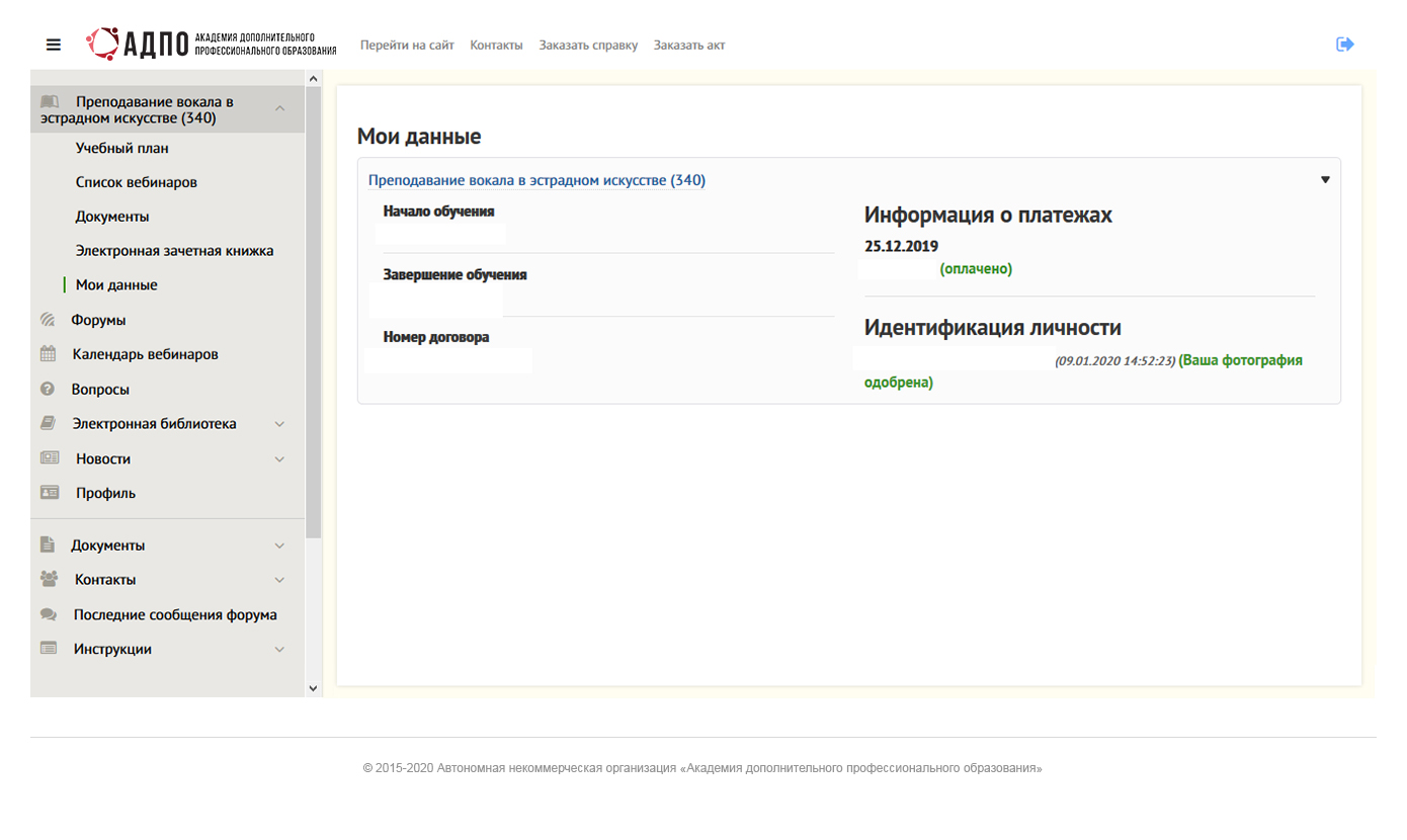 В разделе указаны даты начала и конца обучения, график оплат по договору и другие важные сведения. Вам нужно внести в личный профиль информацию о себе: ФИО и город проживания, по желанию — место работы и должность.