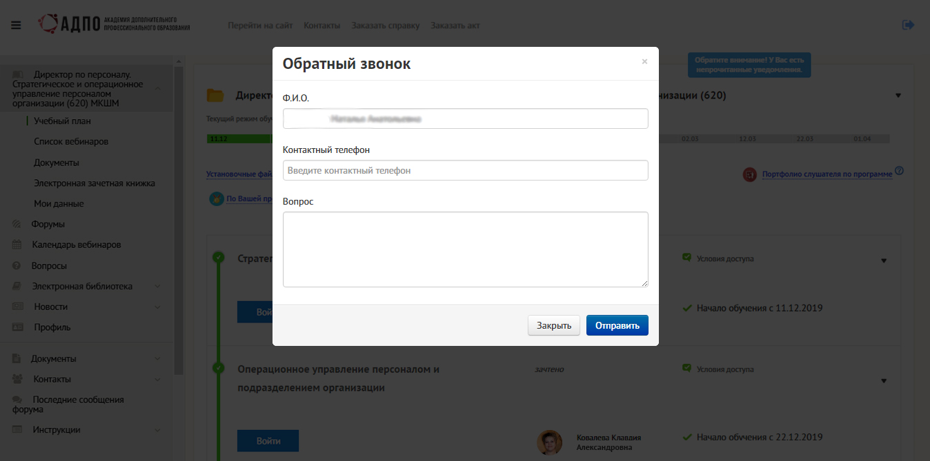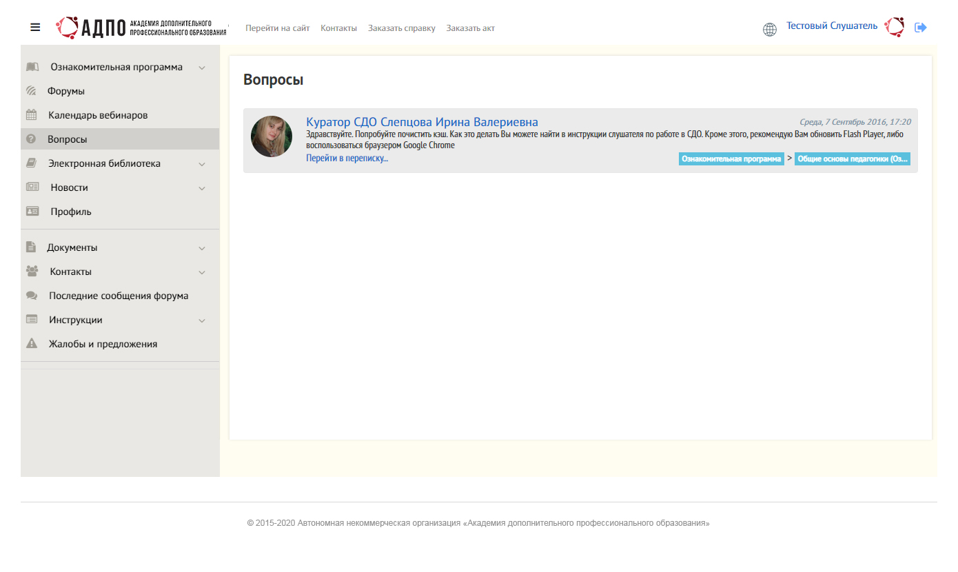 В СДО предусмотрены инструменты для общения между участниками образовательного процесса. Вы можете обратиться к преподавателю за консультацией по учебным вопросам или связаться с куратором по организационным моментам.