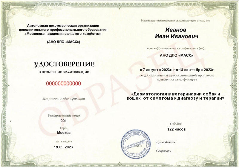 Курс повышения квалификации Дерматология в ветеринарии собак и кошек: от симптома к диагнозу и терапии (122ч)