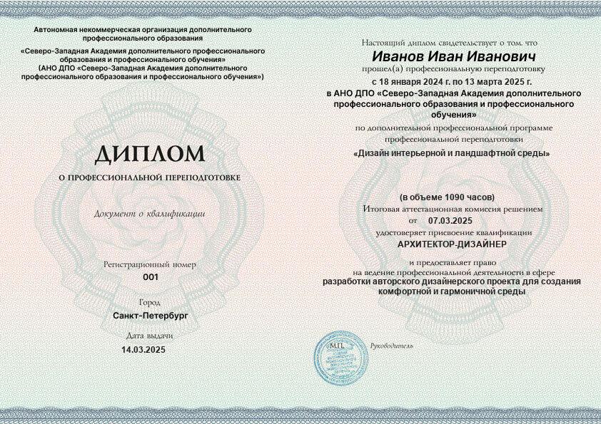 Каждый документ (диплом/удостоверение/свидетельство) соответствует п.2 ст.60 N-273 ФЗ, оформляется на русском языке, печатается на типографском бланке, защищённом от подделок. Ставится официальная печать образовательной организации. С образцами документов можно ознакомиться на сайте в разделе «Лицензия и документы».